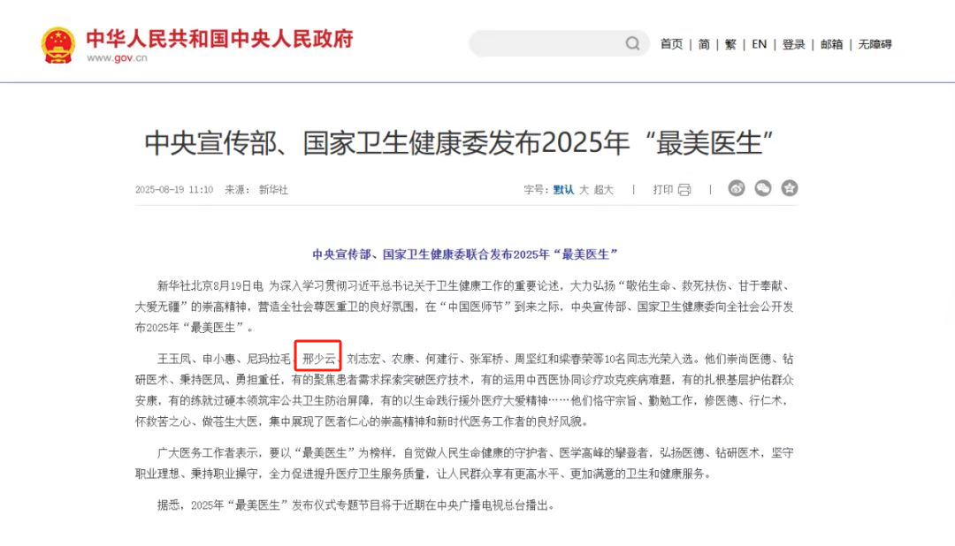 8月19日,在“中国医师节”到来之际,中央宣传部、国家卫生健康委向全社会公开发布2025年“最美医生”。其中,海南省第五人民医院皮肤康复科护士长邢少云光荣入选2025年“最美医生”。